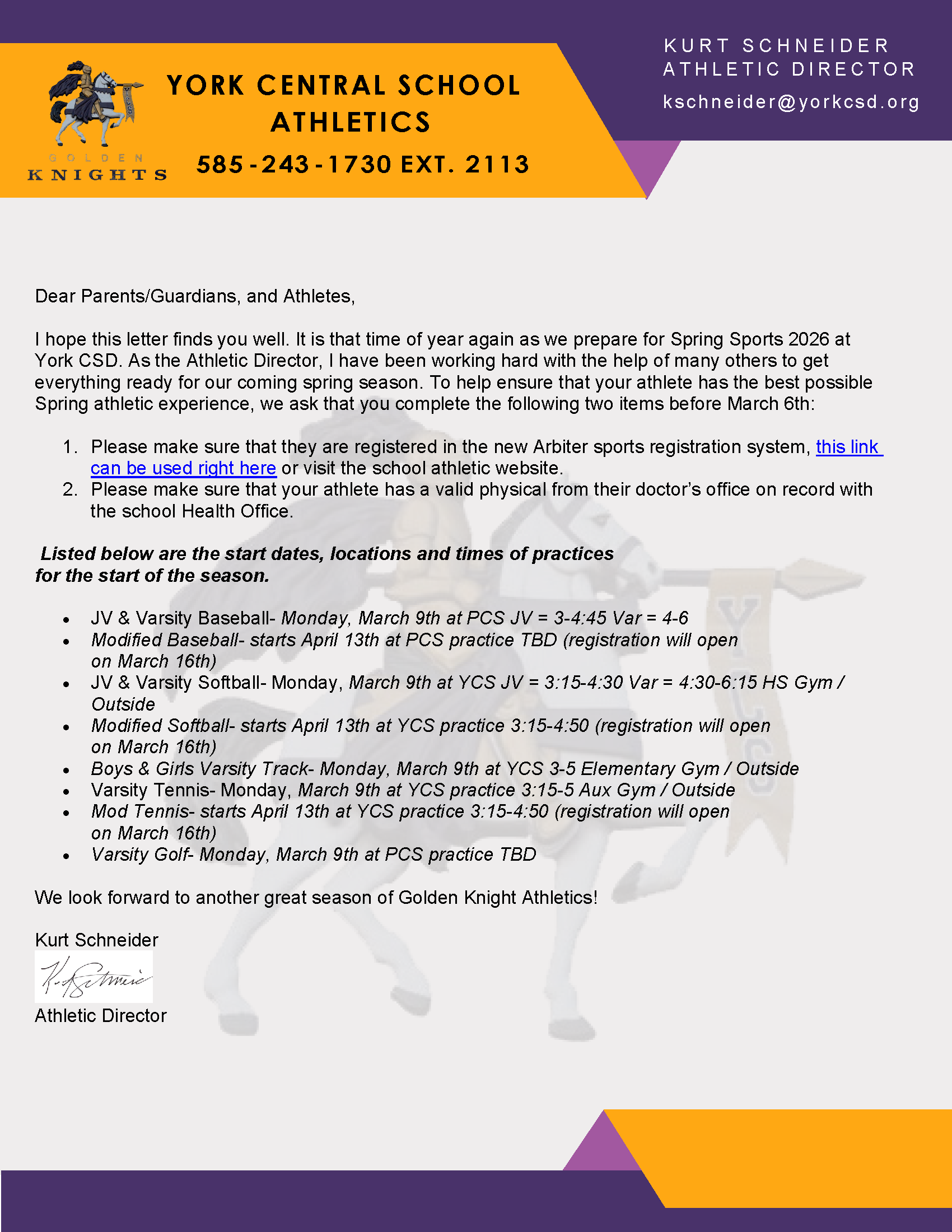 Spring Sports Update from Kurt Schneider, Athletic Director